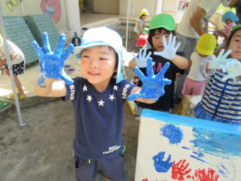 体全身で絵の具に触れて遊び終えた子どもたちはとても充実した表情でした。