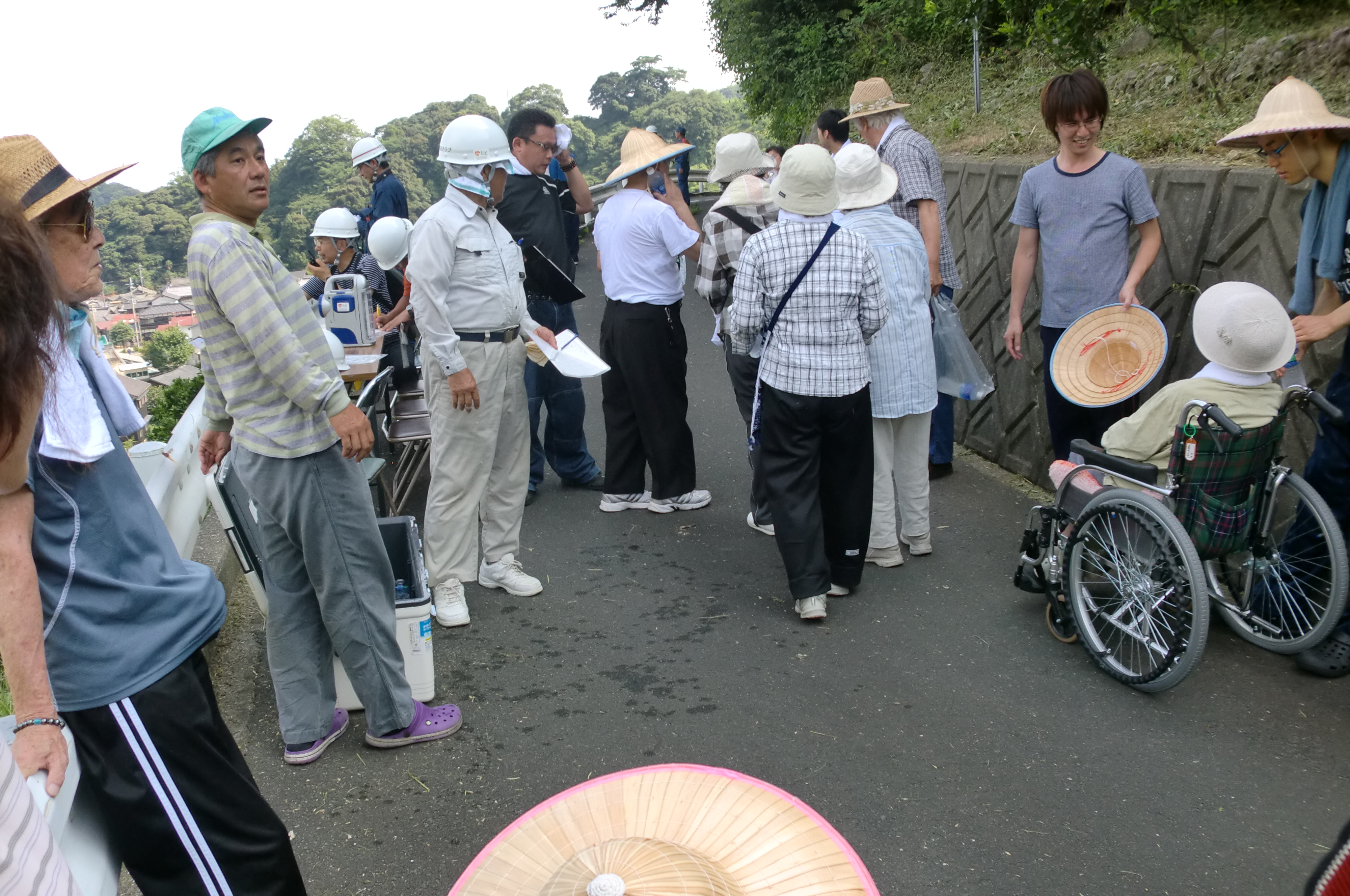 避難中、登り坂での車いす介助の様子 避難後、水分を補給するケアハウス利用者