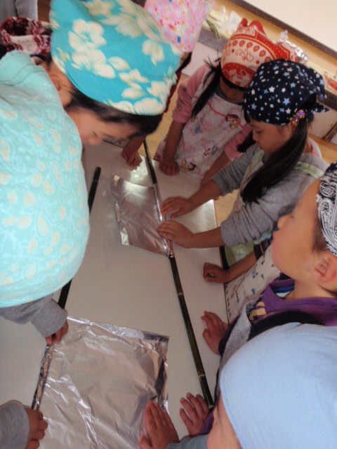 ③切ってきた竹に、丁寧にアルミホイルを巻き巻き
